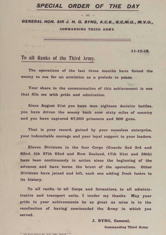 Communication to Third Army, 11 November 1918. From the war diary of Adjutant of 18th (Eastern) Division, National Archives WO95/2914. Crown Copyright.